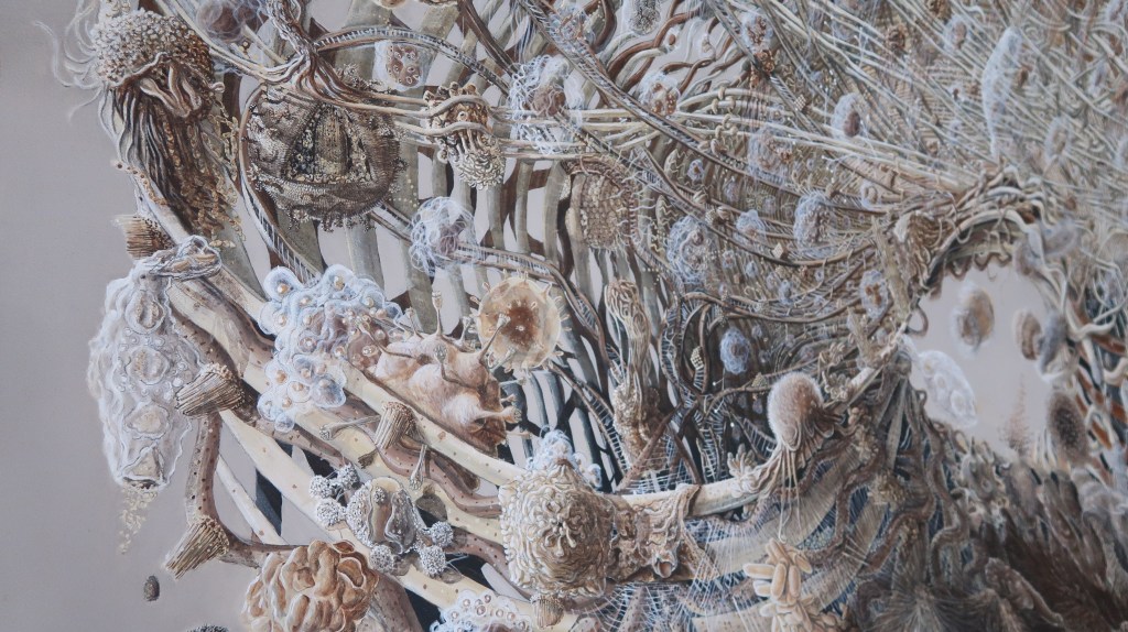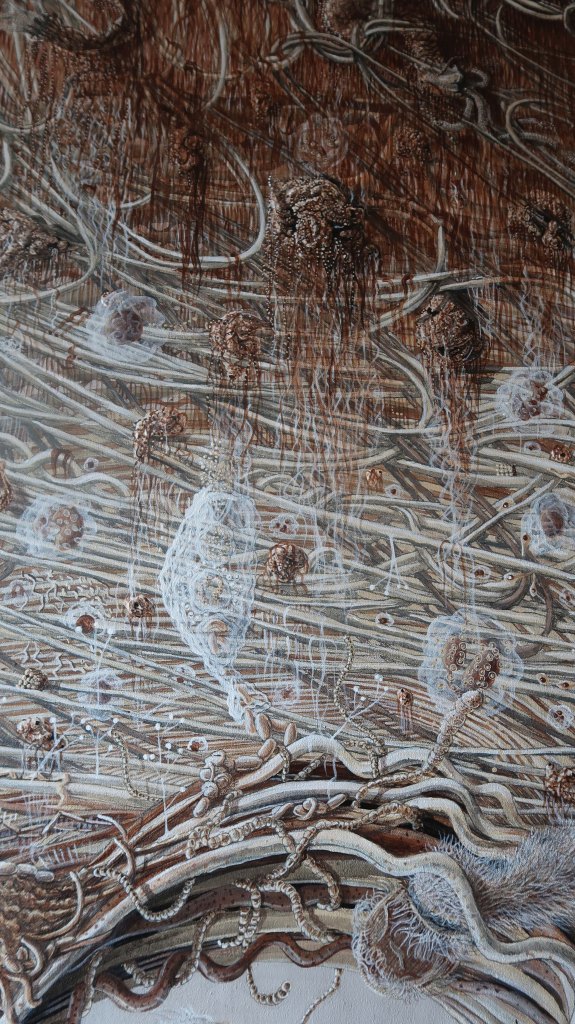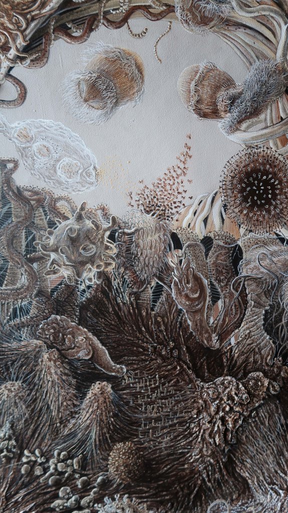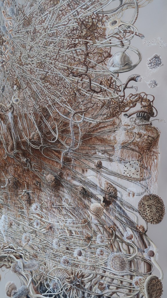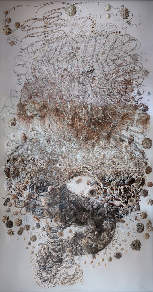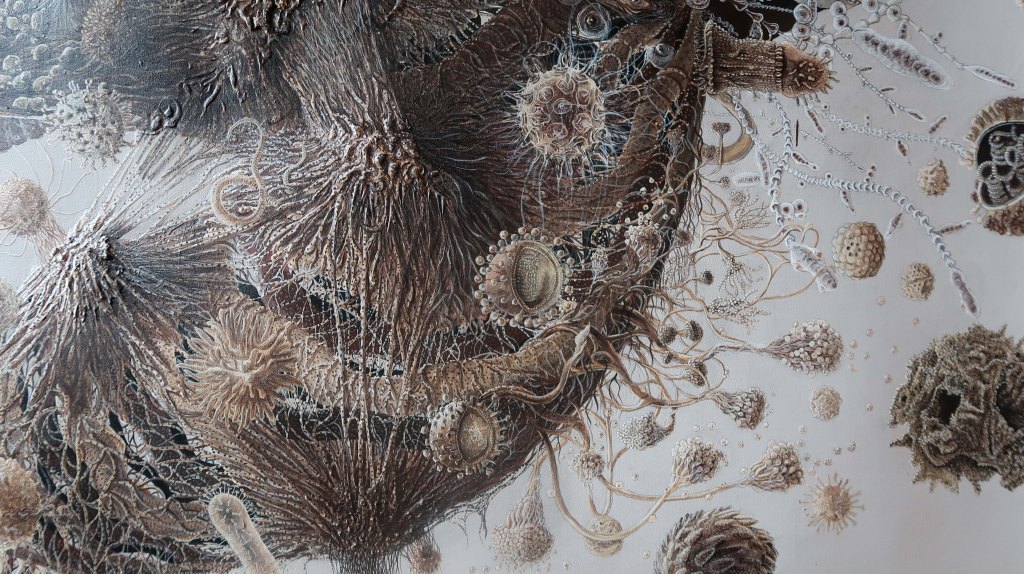 « oe » mêle science, alchimie, récits mythiques et religieux. Cette peinture est issue d’observations du vivant entre macrocosme et microcosme.