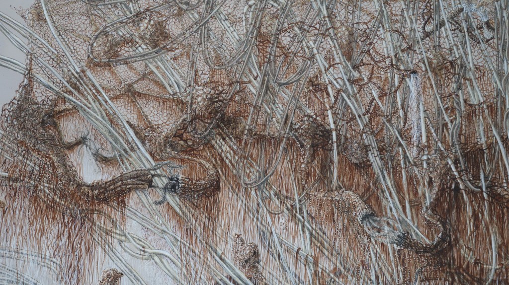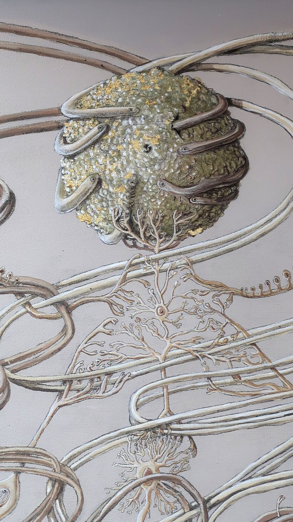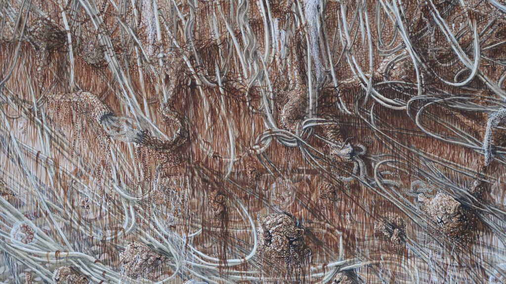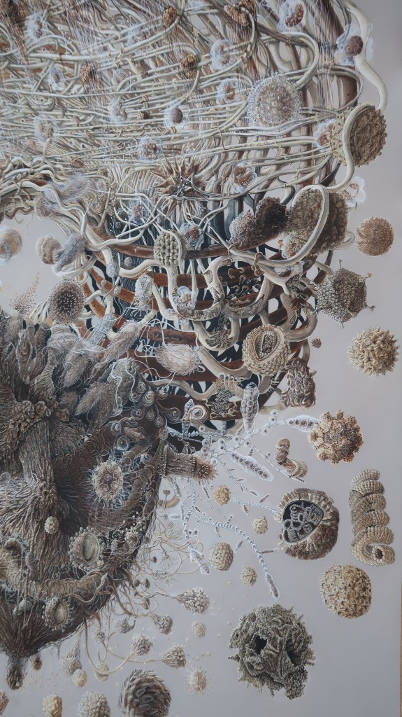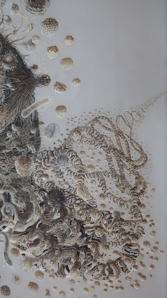 « oe » mêle science, alchimie, récits mythiques et religieux. Cette peinture est issue d’observations du vivant entre macrocosme et microcosme.